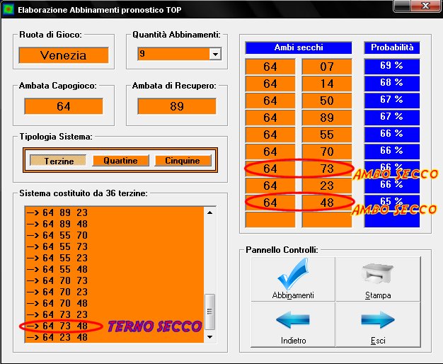 Cliccando sul Pulsante ABBINAMENTI si è aperta la finestra per l'elaborazione degli abbinamenti. Con i primi 9 abbinamenti sono stati centrati: un TERNO SECCO + 2 Ambi Secchi