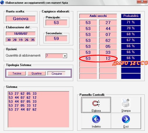 Scegliendo il capogioco Principale (con 4 sfere di probabilità, quindi più probabile di sortita del capogioco secondario) e cliccando sul Pulsante ABBINAMENTI con Numeri SPIA si è aperta la finestra per l'elaborazione degli abbinamenti. Con i primi 7 abbinamenti è stato centrato l'ambo secco.